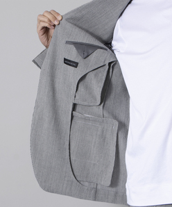 清涼感のある色合いとストライプ調のデザインが春夏らしいジャケットスタイルを演出します。